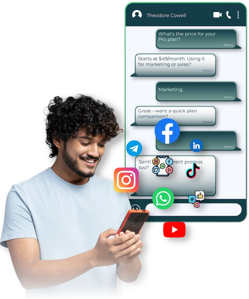Expand across channels, deploy multiple AI agents, leverage advanced automation, CRM/Role-based access control, team management and commerce intelligence. All designed to help you grow without increasing workload.